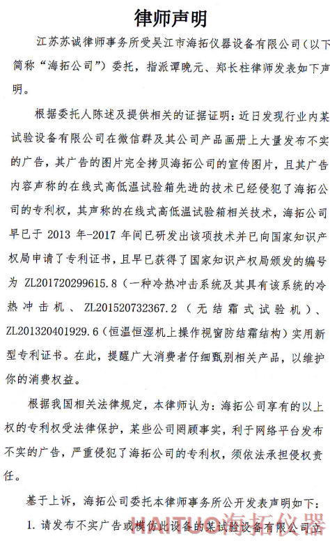 海拓儀器律師聲明:反對侵權(quán)行為 維護公司和消費者權(quán)益摘要:國內(nèi)試驗設(shè)備領(lǐng)先者吳江市海拓儀器設(shè)備有限公司委托律師事務(wù)所發(fā)布了律師聲明,該聲明指出,當前市面上出現(xiàn)了產(chǎn)品專利侵犯海拓儀器權(quán)益,海拓儀器將以法律手段維護自身利益。該律師聲明要求某試驗設(shè)備有限公司立即停止侵權(quán)行為,扯下其在網(wǎng)絡(luò)平臺的相關(guān)廣告和宣傳畫冊并同時停止生產(chǎn)同款設(shè)備。如果該設(shè)備公司不聽勸解,海拓儀器將向人民法院依法起訴該公司侵權(quán)行為,以維護自身合法權(quán)益和維護客戶消費權(quán)益,并建議廣大消費者仔細甄別相關(guān)產(chǎn)品。? ? ? ?近日,吳江市海拓儀器設(shè)備有限公司委托律師事務(wù)所發(fā)布了律師聲明,該聲明指出,當前市面上出現(xiàn)了產(chǎn)品專利侵犯海拓儀器權(quán)益,海拓儀器將以法律手段維護自身利益。??事件源起于海拓儀器發(fā)現(xiàn)市面上有同類設(shè)備公司通過完全拷貝海拓儀器產(chǎn)品宣傳圖片,在微信群及該公司產(chǎn)品畫冊上大量發(fā)布不實廣告。??聲明指出,該廣告聲稱的在線式高低溫試驗箱的技術(shù)侵犯了海拓儀器的專利權(quán),該產(chǎn)品專利由海拓儀器 -